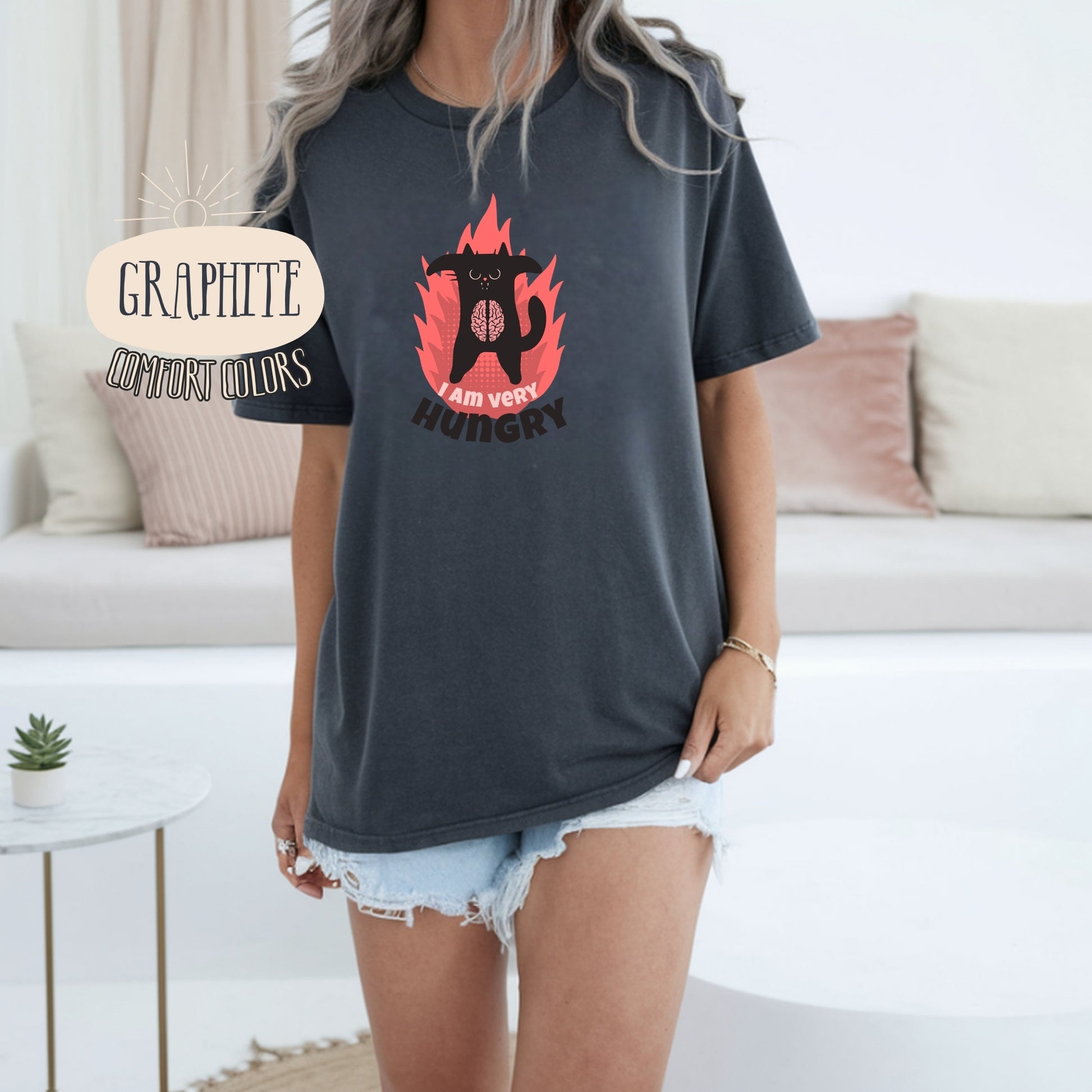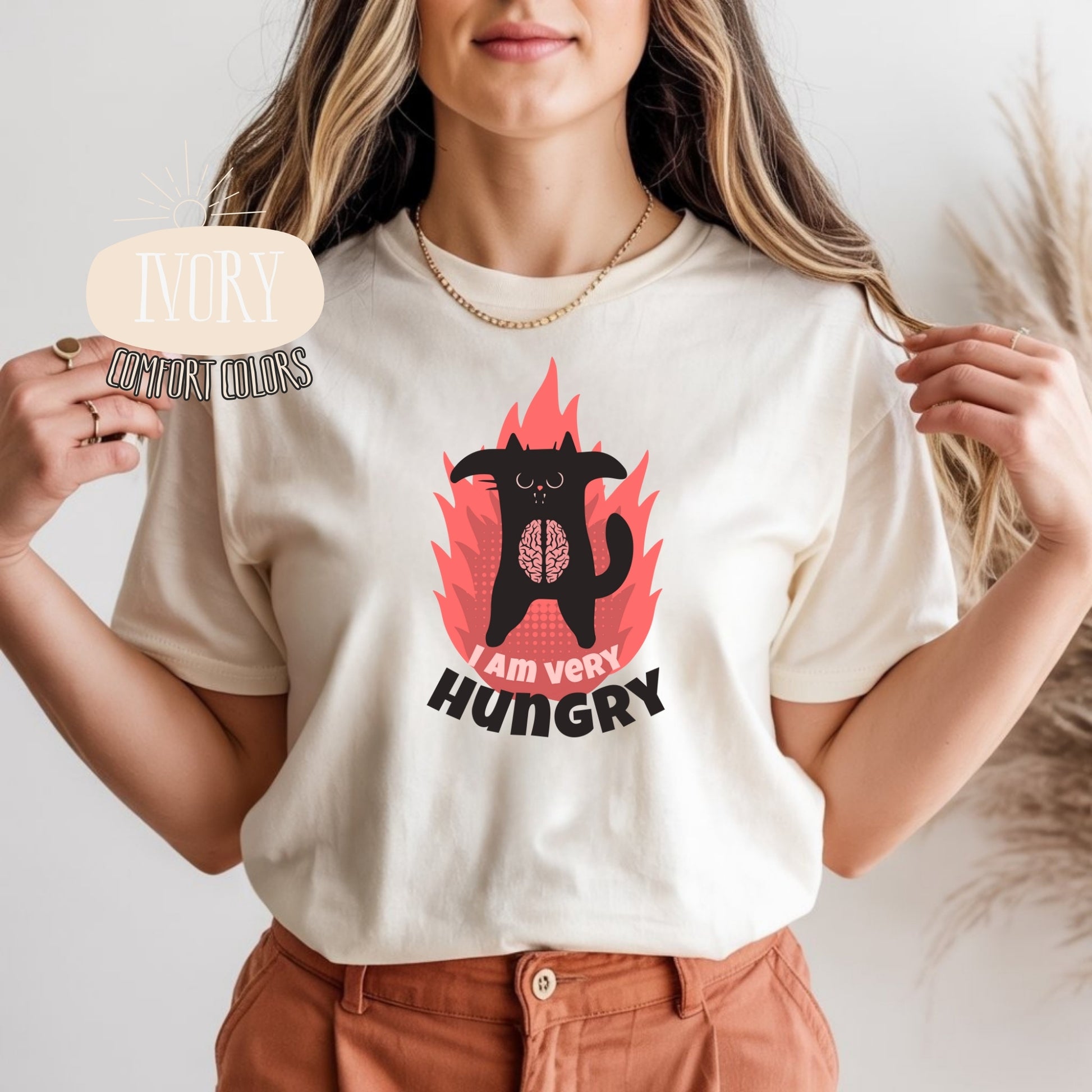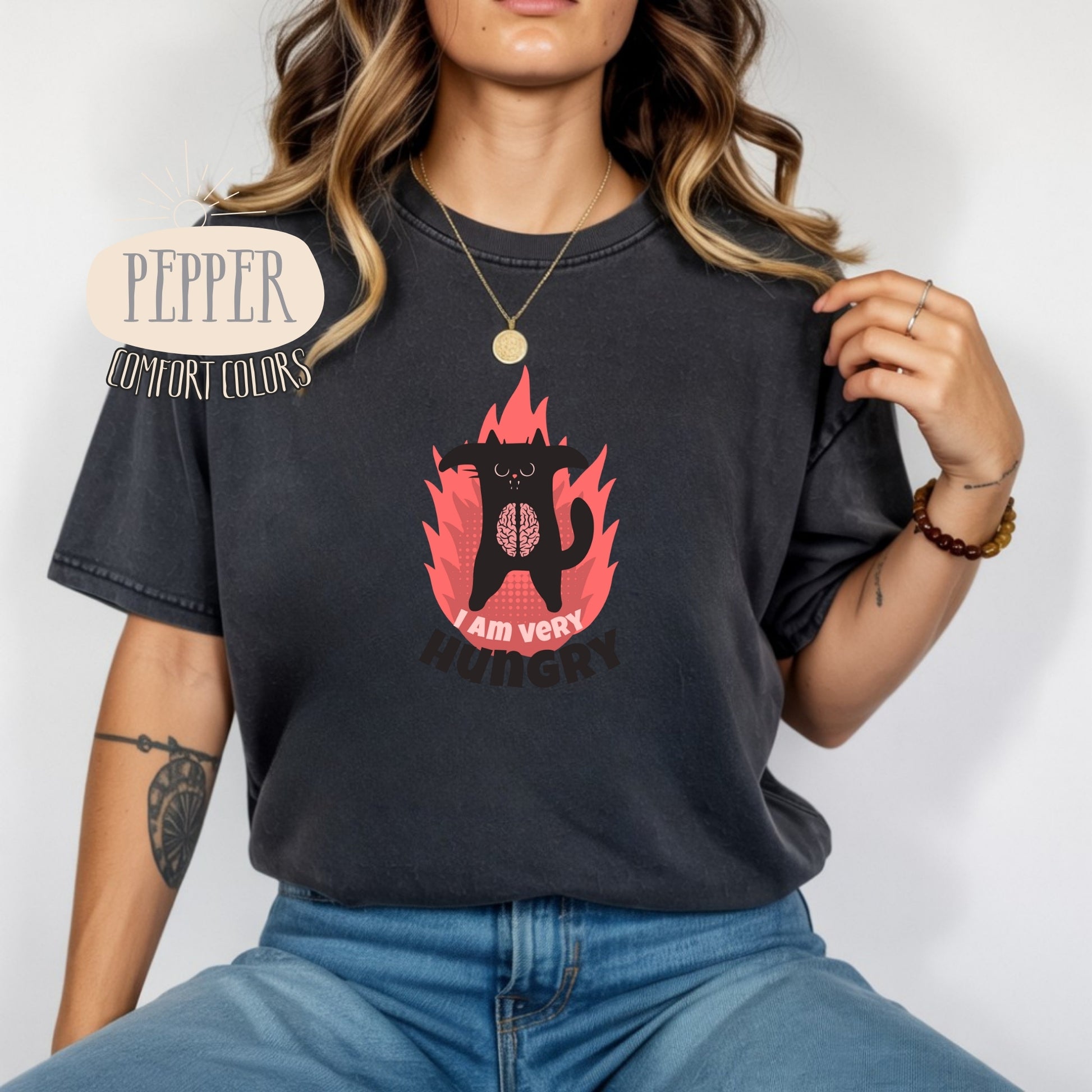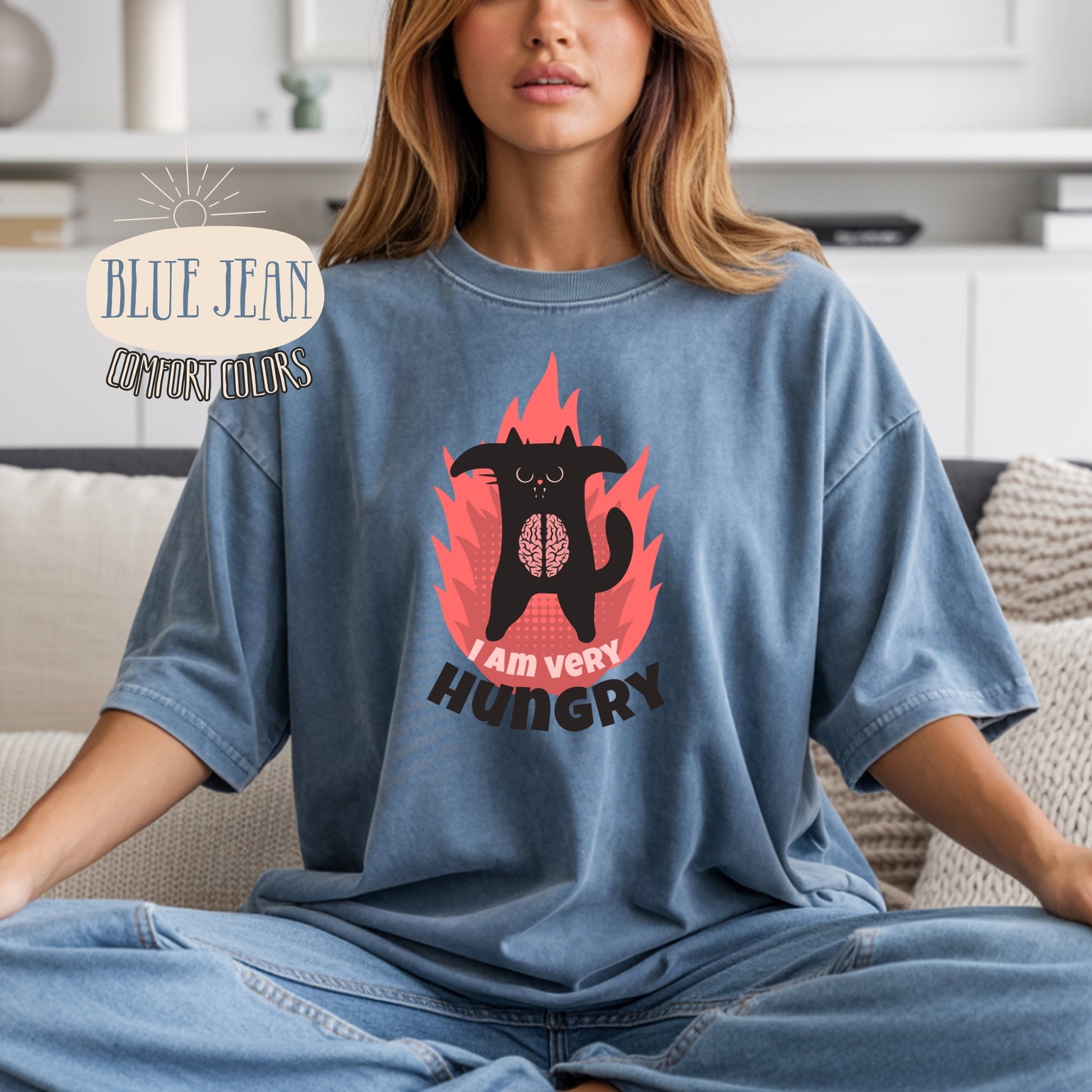 A soft, garment-dyed tee with a playful, slightly spooky design that speaks to people who love dark-humor and cozy, quirky style. The illustration shows a small, mischievous creature framed by stylized flames with the caption “I AM VERY HUNGRY,” giving the shirt a tongue-in-cheek, campfire-monster vibe. The medium-weight 100% ring-spun cotton feels lived-in from the first wear and the relaxed fit drapes casually over jeans or layered under a flannel. Durable double-needle stitching and tubular knit construction make this tee feel simple but well-made — the kind of shirt you reach for on weekend hikes, late-night pizza runs, or game nights when you want to say a little more without saying anything at all.
