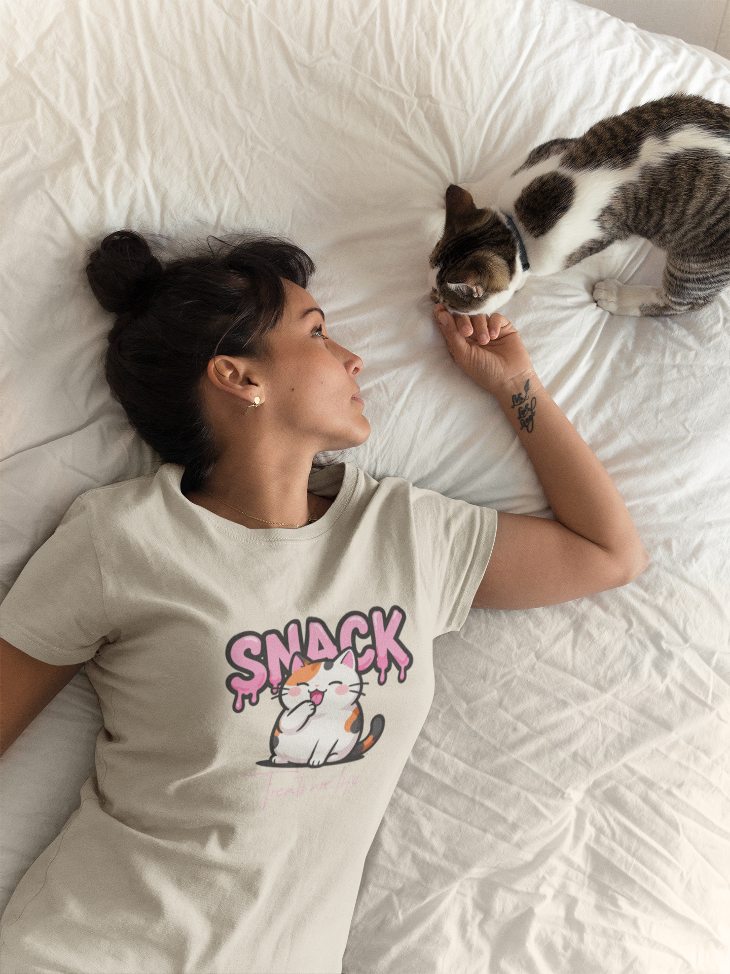Dieses süße SNACK T-Shirt mit der hungrigen Katze ist perfekt für alle Cat Lover, die den verfressenen und liebenswerten Charakter ihrer Samtpfoten kennen!